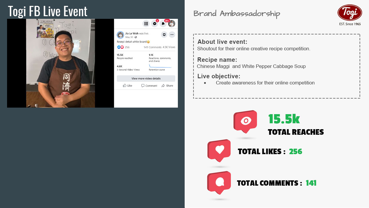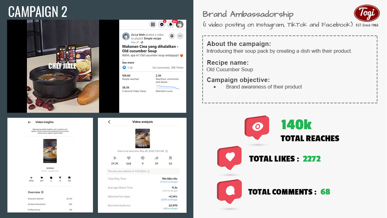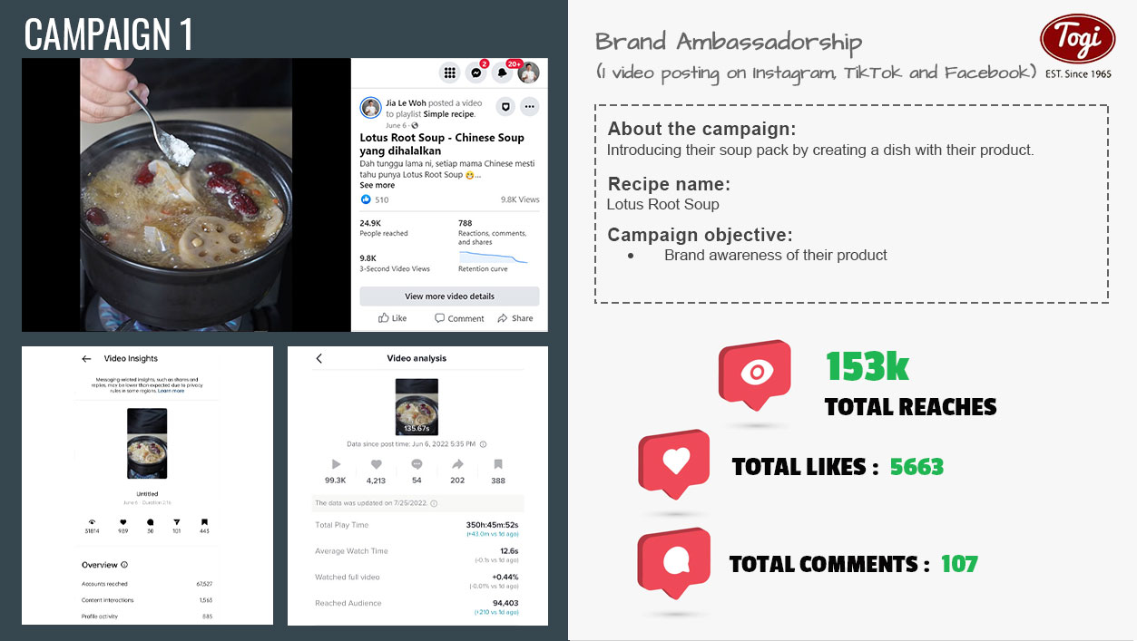 admin2023-05-02T17:25:34+08:00 Milestones Description Campaign Description Chef Jia Le Woh and Chef Zie Zie creates 20+ recipes all together using Togi soup packs Total Reaches: 5,000,000++